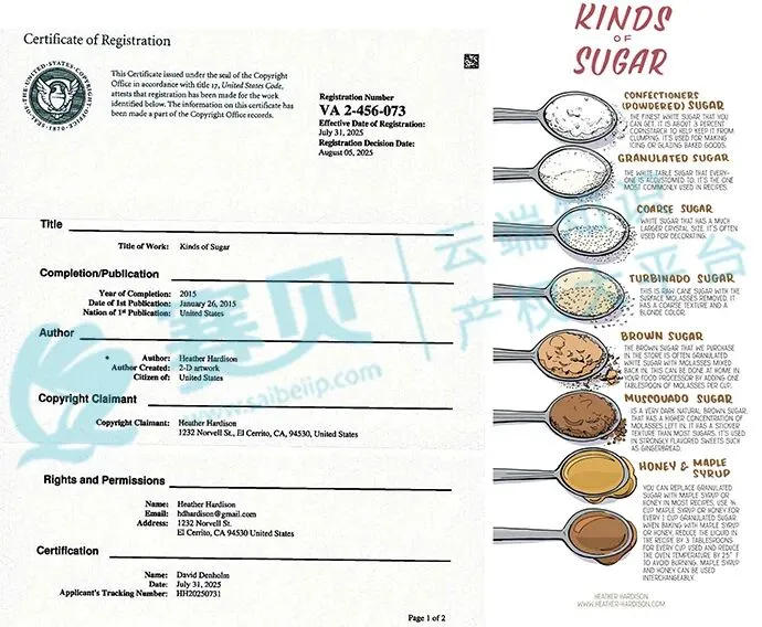 这次维权的是《Kinds of Sugar》(糖类种类)。这款作品的版权注册号是 VA 2-456-073,注册生效日期是 2025 年 7 月 31 日,作品里详细介绍了白砂糖、糖粉、粗糖、原糖、红糖等好几种糖类的特性和使用场景,。赛贝提醒各位跨境卖家,没拿到 Heather Hardison 的授权,不能擅自用在自己的产品上!