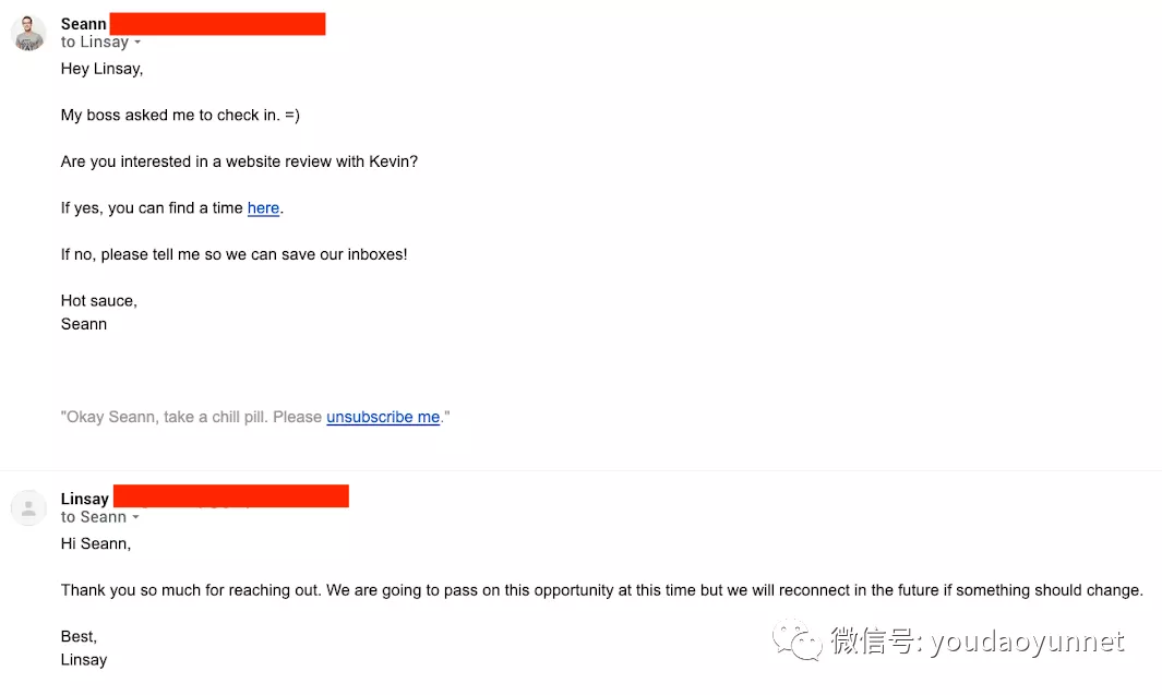 为什么这样做有效果:首先,你要给潜在客户一个理由,让他们知道你为什么有点急躁(也就是说,你保存了对方的收件箱)。这封邮件没有永远等待回复的意思,而是直奔主题。如果你的潜在客户感兴趣,他们可以直接预订时间;如果没有,你可以节省时间。