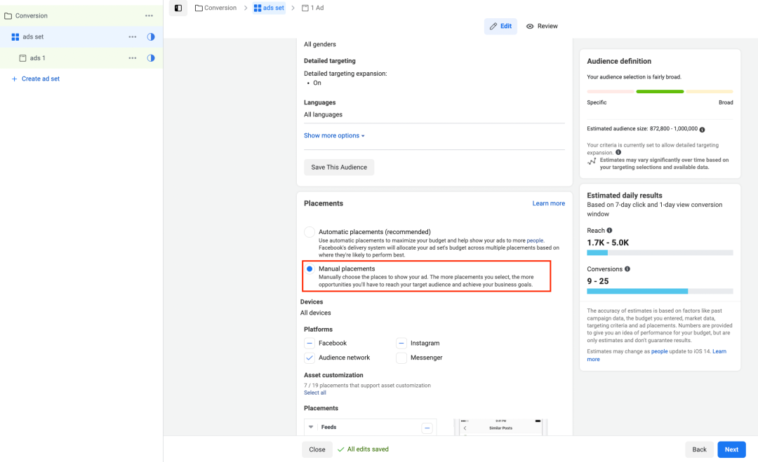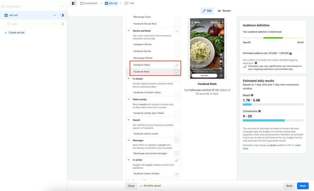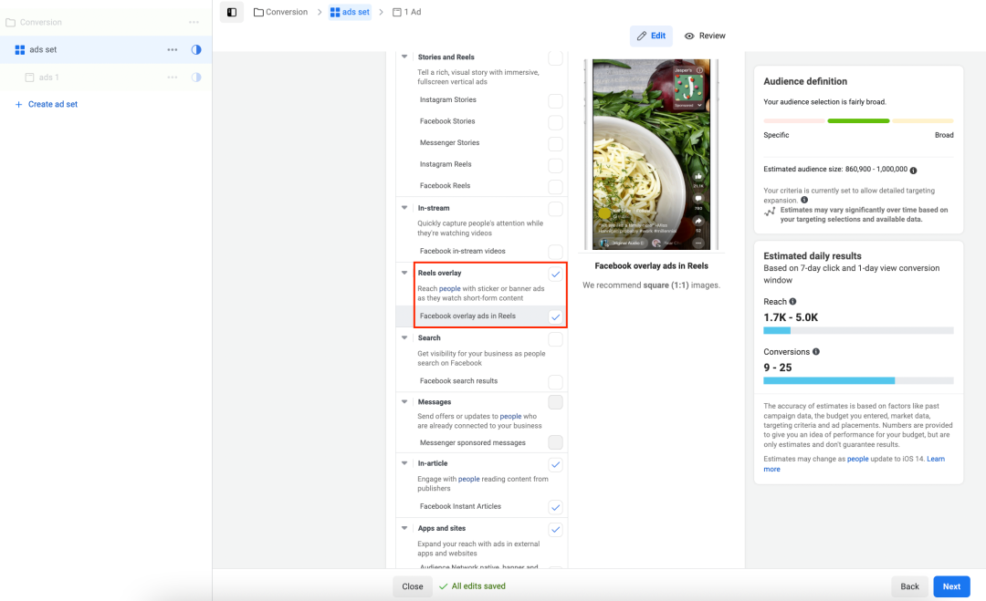 设定方式:在正常的广告创建流程中选择你的广告目标→在广告组层级设置你的像素、预算及受众→在版位设置部分选择手动版位→勾选 Facebook overlay ads in Reels 版位→完成广告创意的上传和正常设置发布。