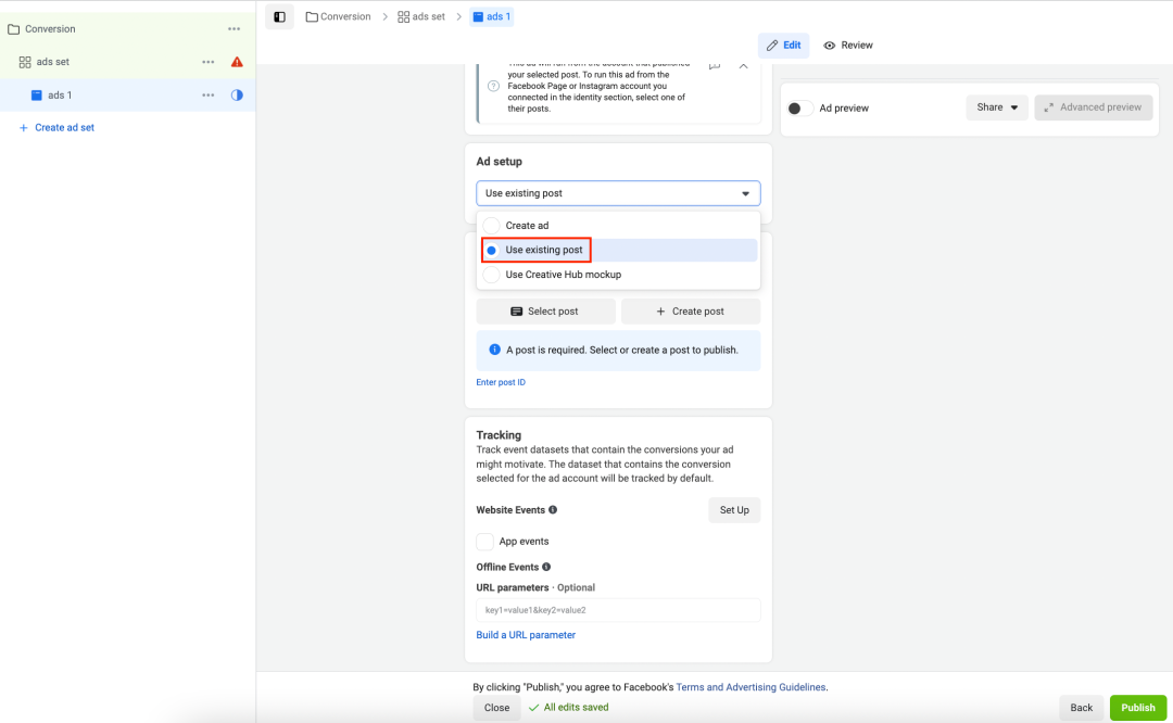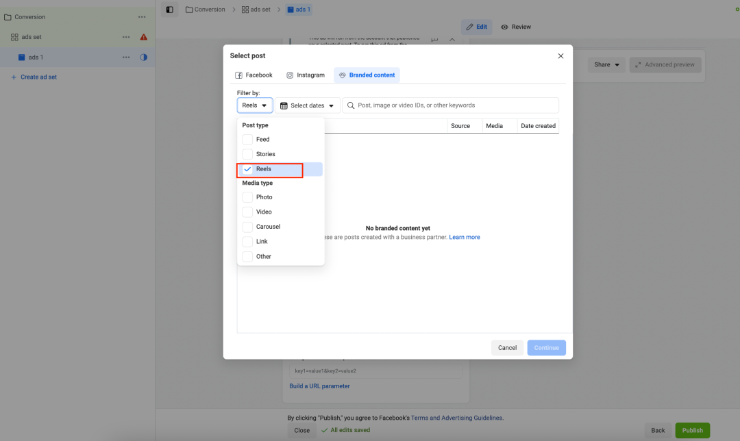 设定方式:在正常的广告创建流程中选择你的广告目标→在广告组层级设置你的像素、预算及受众→在版位设置部分选择手动版位→勾选 Facebook Reels、Instagram Reels 版位→在广告创意层级选择使用现有帖子→品牌内容→下拉就可以看到 KOL 发布并标记你的帖子,选中帖子即可进行发布推广。
