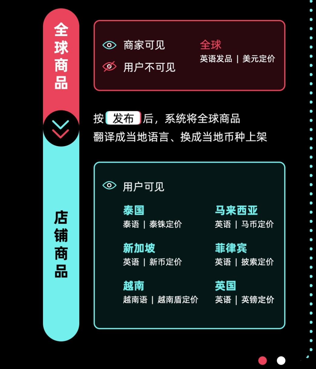 目前,TikTokShop只开放了英国和东南亚五国站点,跨境商家在小店后台一键发布商品后,可以选择在多国售卖,系统会自动将商品信息翻译成站点的当地语言。