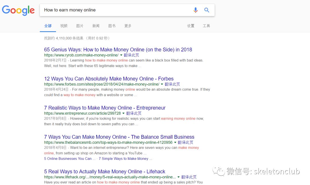 所以,对于想在互联网上赚钱的老外来说,他们第一位使用的是“Google”。谷歌搜“How to earn money online”。