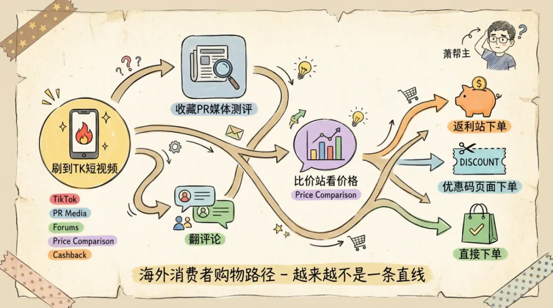 比如:消费者可能在早上从刷到一个TK红人短视频里面了解到了某个品牌,中午在电脑端浏览网页的时候收藏一篇关于该品牌PR媒体测评,晚上睡觉前在 Reddit / Deal论坛翻其他人的评论,同时在比价站看价格,最后可能是在某个返利站、某个优惠码页面完成下单。