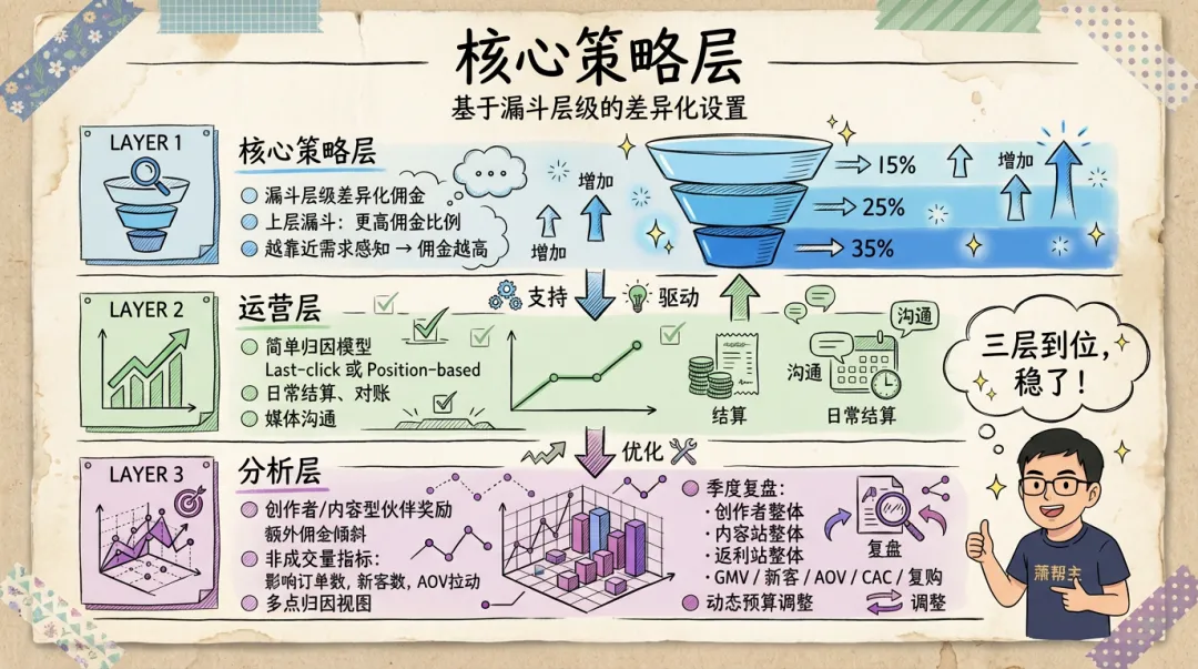 每个季度看一次:创作者整体、内容站整体、返利站整体,分别在 GMV / 新客 / AOV / CAC / 复购上表现如何。