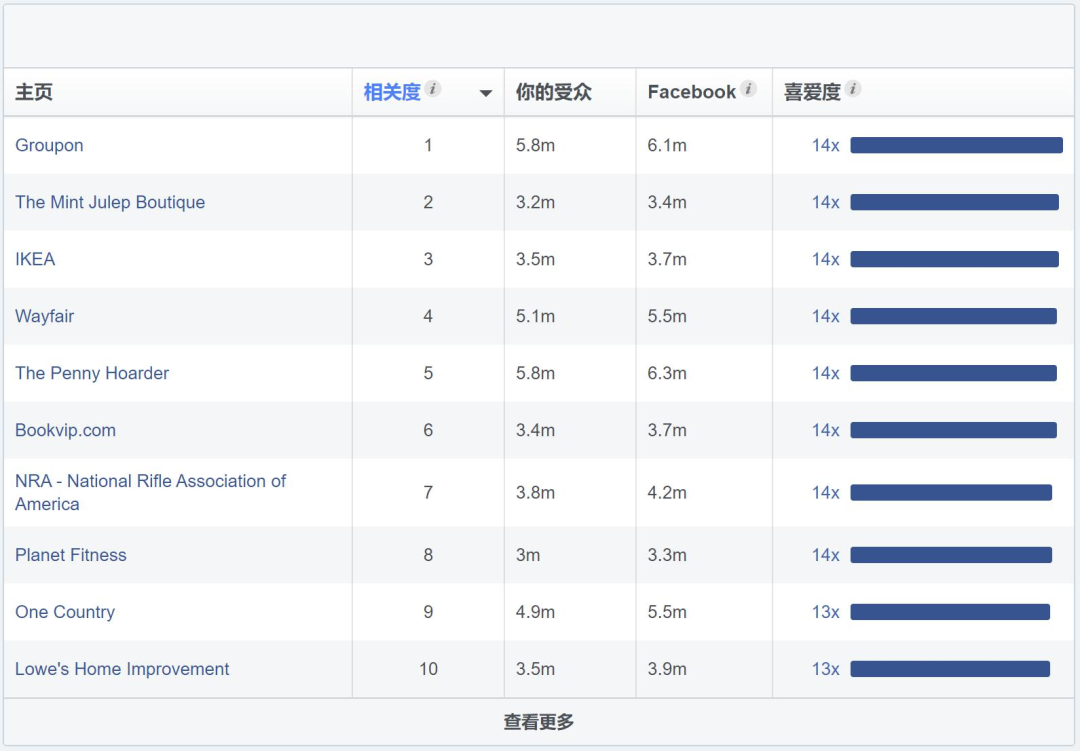 · 相关度 — 显示最可能与您的受众相关的主页,依据为喜爱度、主页规模和您的受众中有多少用户 赞了对应主页。