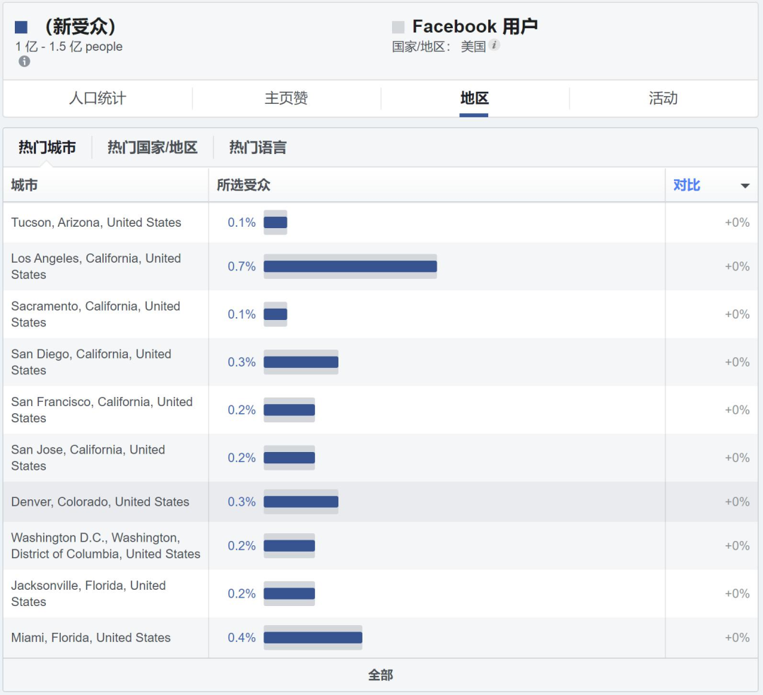 “地区”显示的信息包括:所选受众的主要居住城市、国家/地区和语言,以及与您所在国家/地区的 Facebook 用户的对比情况。Facebook 会综合多种因素来确定地区,包括用户提供的居住城市信息、公 开分享了位置的活动及其他因素。