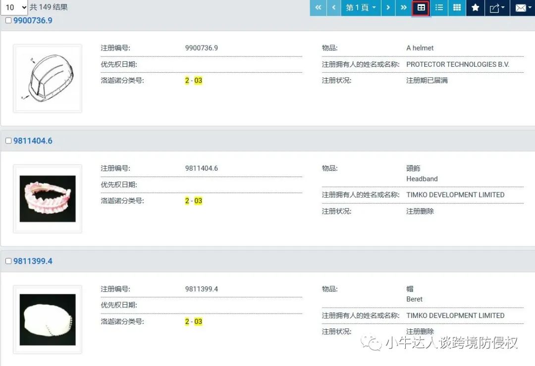 ①“资料及图像”显示每项外观设计的注册编号,优先权日期,表述(一幅主图),洛迦诺分类号,物品(名称),注册拥有人姓名和名称,注册状况。