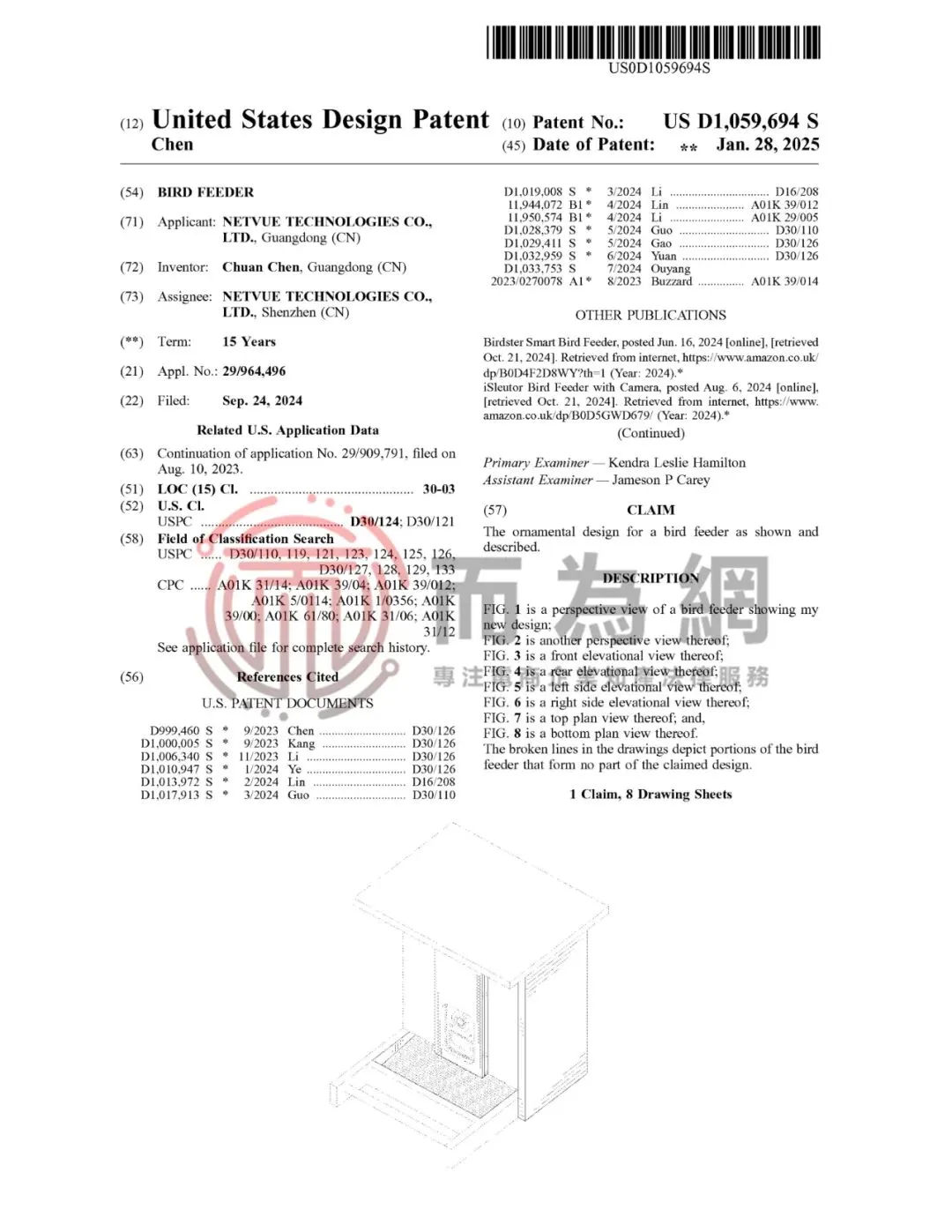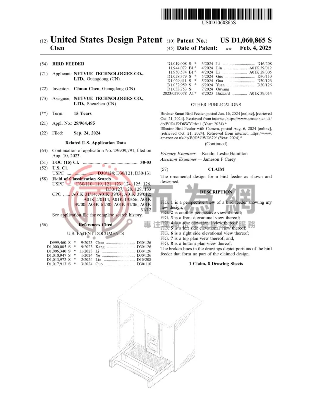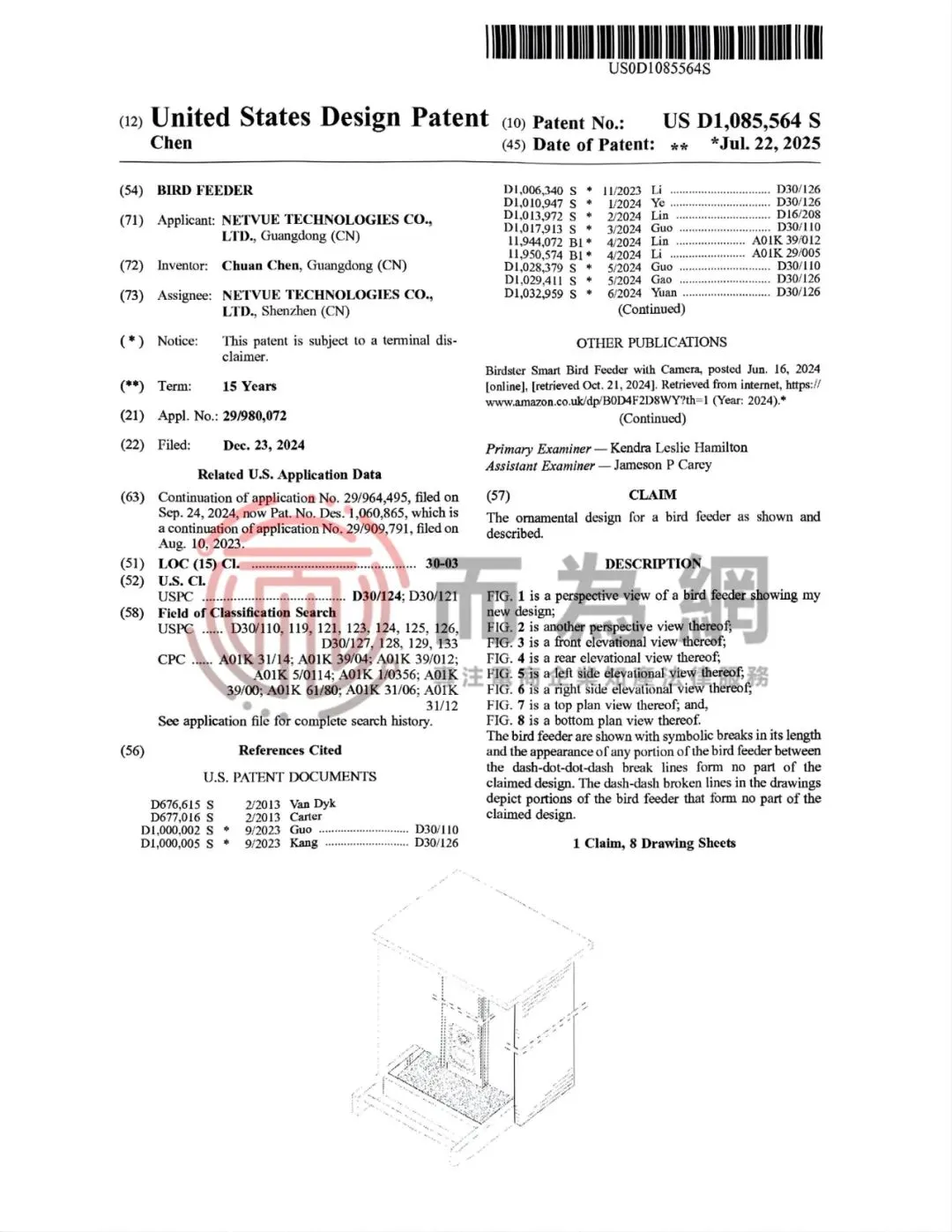 【侵权快讯】25-cv-6812 速看!国人原告发起Netvue 喂鸟器三项外观专利维权!