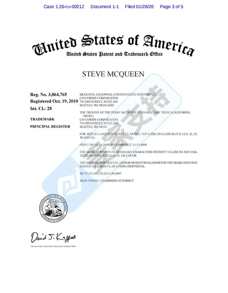 26-cv-00212,TRO冻结预警!Steve McQueen遗产信托挥刀跨境圈,这些产品立即下架!