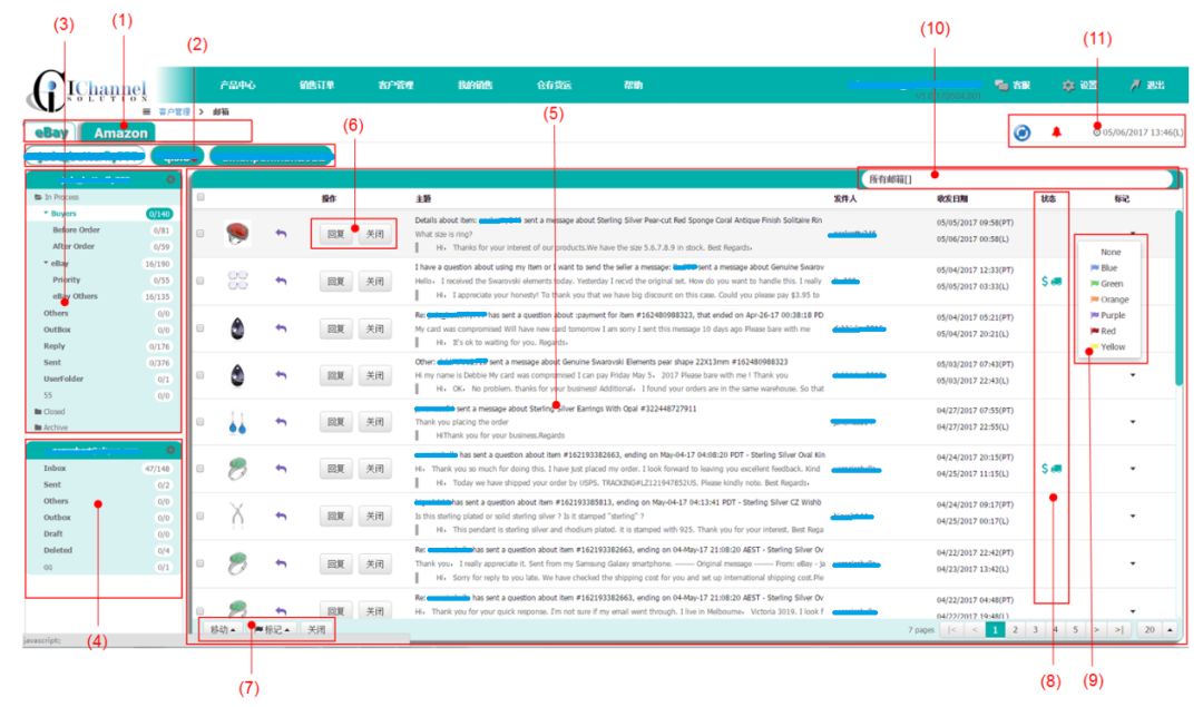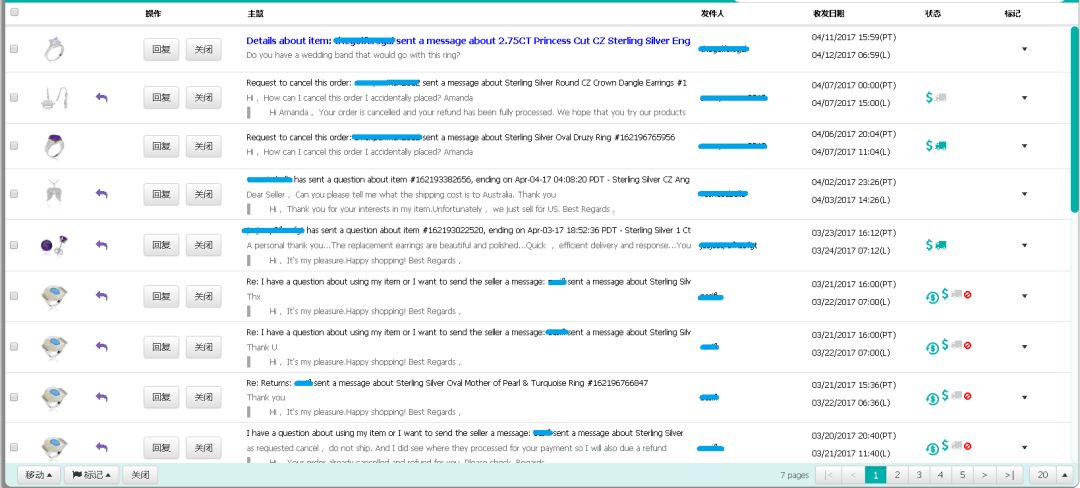 中间是邮件列表,在这里我们可以看到,邮件相关的产品图片,回复状态,操作按钮,可以点击进行回复和关闭;主题的内容以及部分邮件内容;发件人ID;收发日期;订单的状态以及可以对邮件进行旗帜标记。