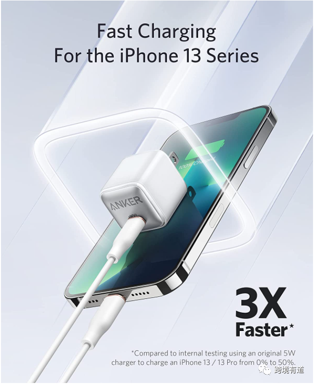 anker就是一个很好的例子:可以看到下图中anker表达充电快速的方式别具一格,整个构图非常简洁大方,广告语“3X Faster”突出要点直击人心。