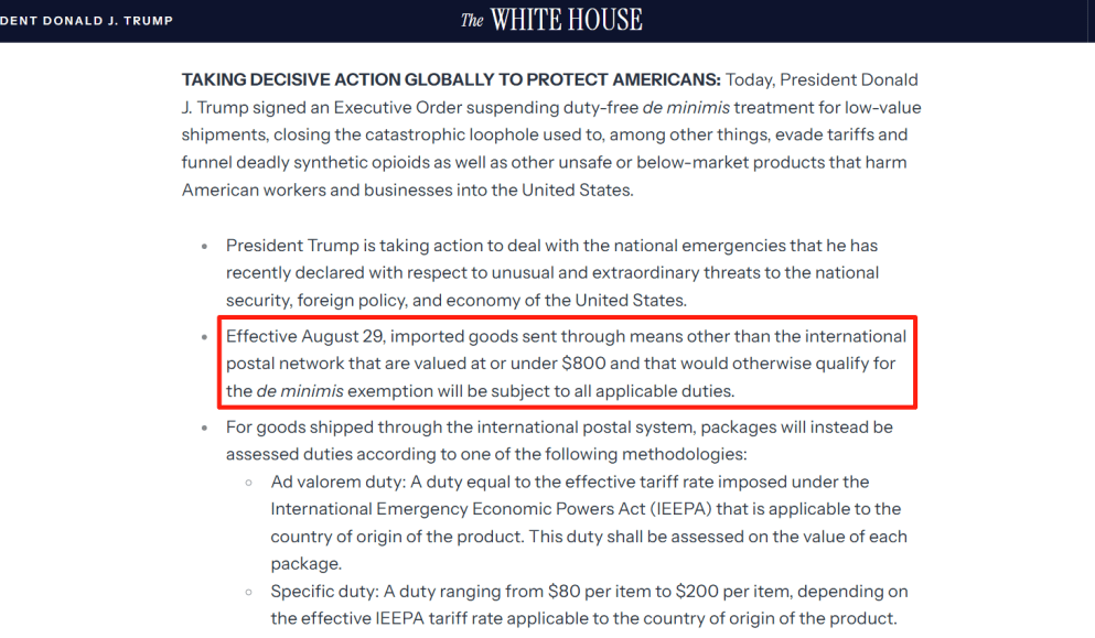 7月30日,美国白宫发表声明称,美国总统特朗普签署一项行政命令,暂停对低价值货物的最低限度免税待遇(De Minimis)政策。