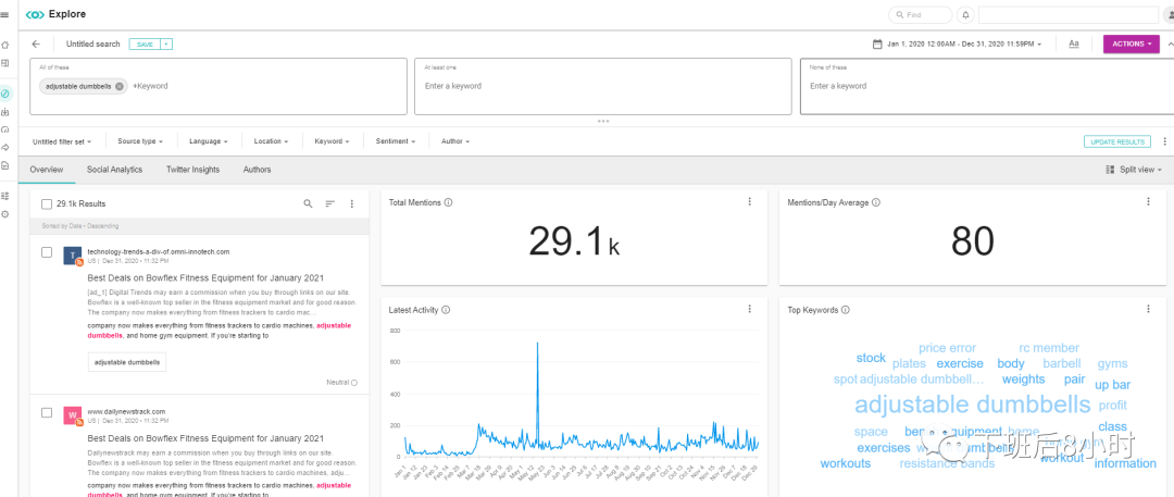 Meltwater是全球比较知名的媒体监测数据分析工具,费用的话也是相对贵些但功能还是非常强大的,我们先来看看第一种方法,输入产品关键词或者竞品的关键词去看看已经报道的一些媒体跟博客,比如我们就以运动类的产品哑铃为例,设置时间段,区域等