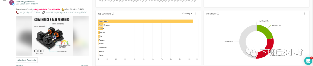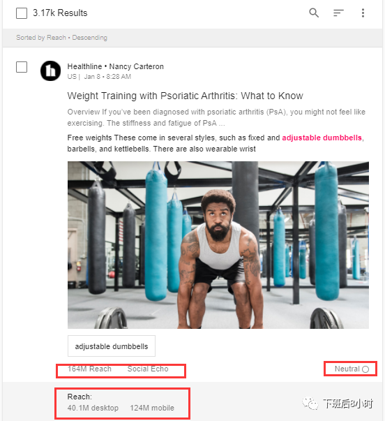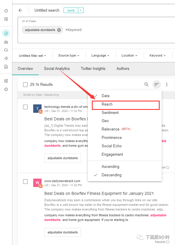 然后下面这个筛选的选项我一般是按照reach去选择就是哪篇文章触达的人群最多,然后我们去联系这个编辑帮我们写篇测评,效果应该相对不错些,下面的红色方框可以看到reach的人数以及对这个所持的态度是positive, negative还是neutral,可以看到过去一年meltwater抓取到的关于哑铃的这个词共有29.1K的媒体报道,那么我们就可以把这些article的文章链接给导出去,因为是按照reach的人数来筛选的,相对而言排在前面也基本上是比较大的媒体,然后去开发里面编辑的联系方式。
