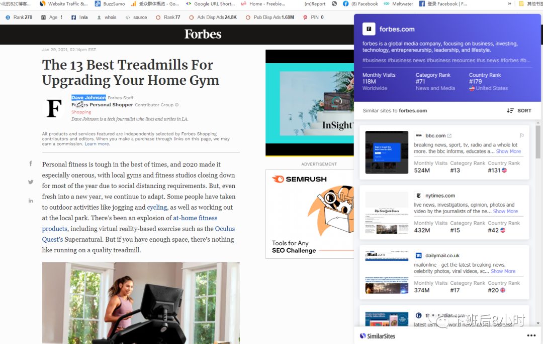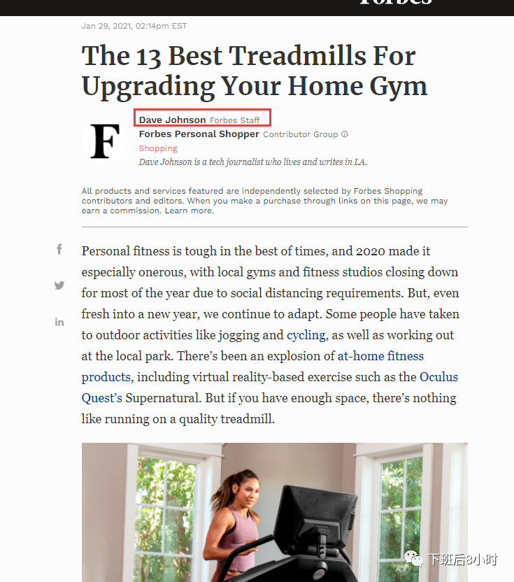 比如我们现在具有媒体监测功能的Meltwater 找到下面这位福布斯的作者写的关于跑步机的评测,那边我们就去具有发掘全球记者编辑库的meltwater去看看能不能找到这位编辑。