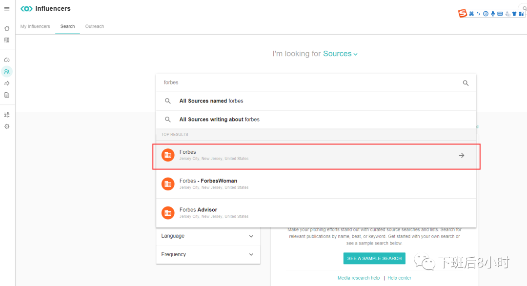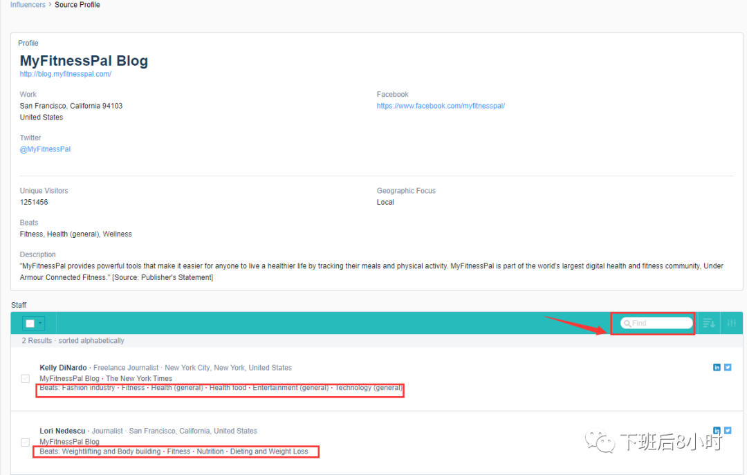 比如以第一个myfitnesspal.com为例放到meltwater里面去,然后弹出2位编辑下面的红色方框是他们擅长的专题,如果给出的媒体List很多就像上面的那个forbes的作者,我们也可以在搜索那里选择擅长fitness的这块的编辑然后去发掘。