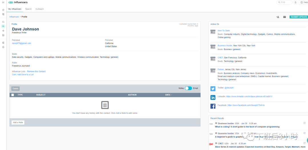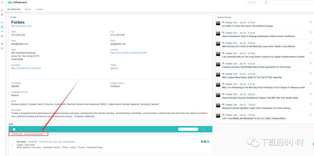 刚刚好可以找到这位编辑,以及他的邮箱,联系方式,过往职业经历,社媒账号以及过去写过的一些文章等都非常清楚,可以说是非常清楚了,另外如果你要找的编辑没在List中也没关系,可以按照其他的筛选条件,比如fitness类的等去筛选一些编辑出来,同样也可以去联系他们去做一些评测报道。