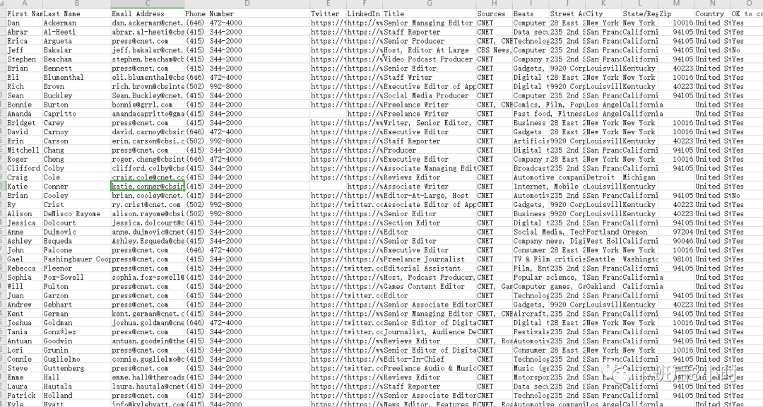 之前按照这种办法,把cnet的编辑都给导了出来,其实从下面的表格来看是非常非常详细的,有邮箱,电话,职位,主体等等非常详细的信息,另外就是你可以在meltwater里面创建个campaign,把这些相关的编辑联系方式创建一个list然后就可以在系统内部发邮件给他们,系统也会有提示邮件的打开率以及邮件正文里面的链接打开率。