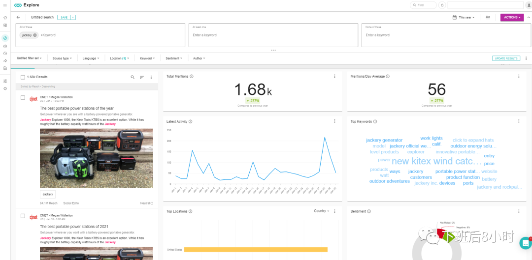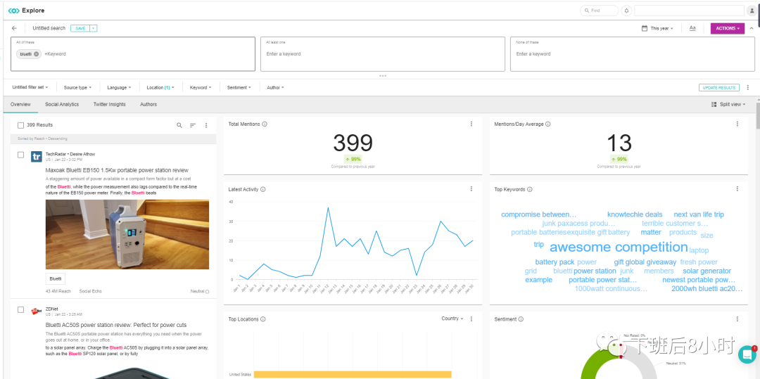另外需要说的是Meltwater主要是媒体的数据监测工具,如果你用竞品或者品牌名去设置,会更能直观看到你跟竞品的差距在哪里以及竞品做营销活动的线路图,比如就以jackery跟bluetti这2家做储能的产品来看看,媒体报道的次数以及同比增长,用户评论的点以及所持态度等都有个比较不错的比较,就可以把对竞品进行报道的媒体给导出来,一个个去开发。