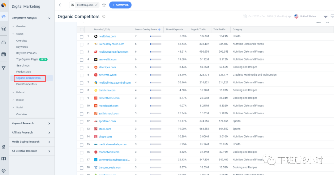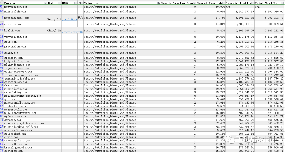 接下来我们看看第二种的方法,就是先用similarweb的工具把关于这个产品行业的媒体给到出来,然后再用全球记者编辑库的meltwater去找里面编辑的联系方式,首先我先找到一个关于健身fitness的比较大的网站livestrong.com,放到similweb的付费工具中去,然后找这个网站的同类的网站,如下图所示可以看到很多,一键把这些网站域名都导出去就是下图中的域名List以及流量情况,然后有了域名之后就可以把域名放到那个全球记者编辑库那里去匹配对应的编辑资源以及联系方式