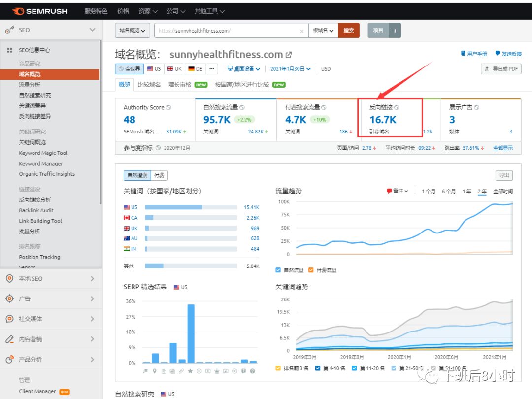 上面主要讲的是使用meltwater找到相关的媒体博客编辑的方法,接下来可以看看用sermush,ahrefs等seo工具给竞品做过的相关的媒体博客外链给导出来,然后去联系分析,就以semrush为例, 输入竞品的网站域名,然后可以看到很多外链的情况,就可以把这些外链给导出来然后去开发,找竞品的外链是比较快的一个方法开发跟自己产品相关的博客媒体等资源,当然semrush还有很多非常多的其他功能,现在除了看外链之外,其他经常用的主要看关键词一些情况一些竞品的广告文案,素材等,最重要的semrush对选品有着非常非常重要的参考意义,争取下篇讲讲如何使用semrush, similarweb等工具大数据选品的。