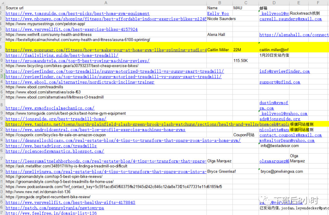 导出来的外链大概就是下面的样子然后打开链接去开发编辑的联系方式,这个开发编辑的联系方式是比较费事费力的,不能急躁的,尤其是比较高质量的外链资源以及后面邮件的谈判沟通等都是非常重要的。