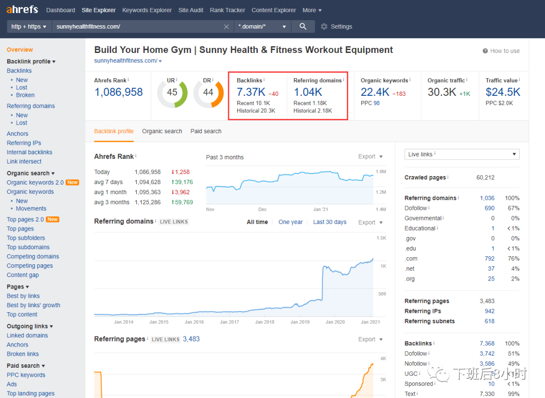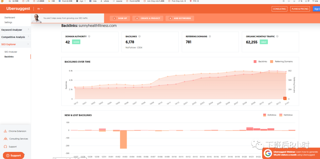 其实Ahrefs的用法也是差不多的,先输入竞品的网站域名然后把外链给导出来,semrush跟ahrefs都是收费的,如果需求量不是很大的建议使用https://app.neilpatel.com/这个工具,目前看关键词数据以及外链等还是免费的 能满足大部分的需求。
