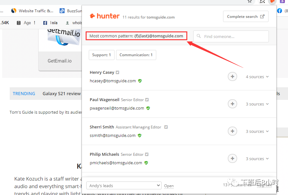 (2)第二种就是用email hunter插件, 去找一些邮箱,之前已经论证过hunter的邮箱准确性还是可以值得参考的。