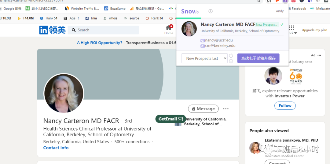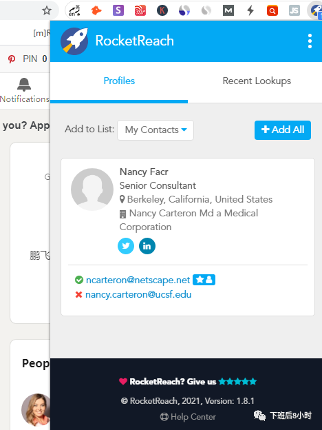 一般大的媒体编辑都会有自己的领英,我们先去搜到他们的领英账户,然后用上面的三个插件去找到邮箱,比如以下面这位非常有名的编辑为例,点击她下面的领英账号,也可以直接复制名字去领英搜一般大的都是可以搜到的,用了3个插件共导出来4个邮箱: