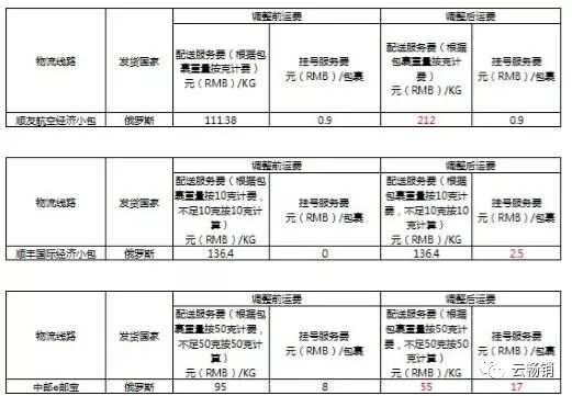 速卖通发布公告称,因物流线路成本变化,北京时间2018年08月01日起,线上发货“顺友航空经济小包” “顺丰国际经济小包”“中邮e邮宝”的运费将进行调整,价格调整如下表所示: