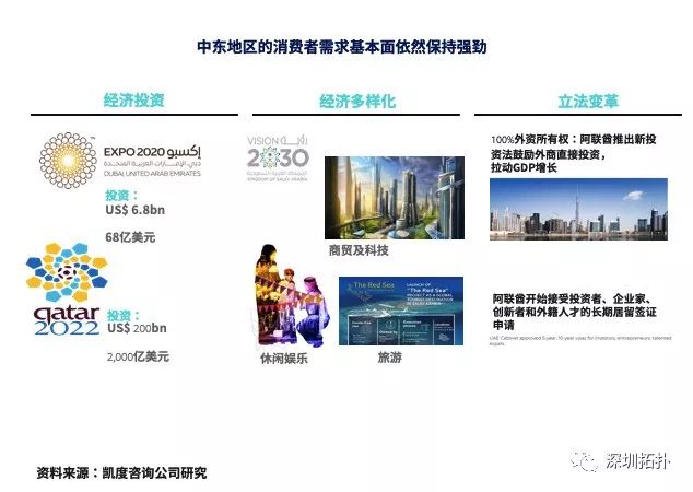 中东地区包含多个市场,且这些市场在经济繁荣程度、消费者需求、数字化普及率和零售结构及市场成熟度等方面均各不相同,例如阿联酋、卡塔尔和巴林的发展程度远高于伊朗和埃及。其次,中东地区各市场未来的发展速度及方向亦各不相同,其中阿联酋、沙特阿拉伯、土耳其及埃及等市场更具价值。