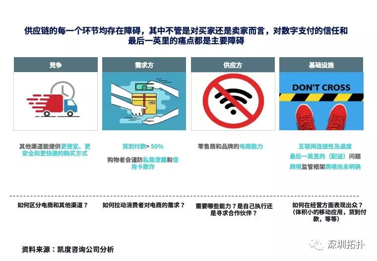 普遍而言,供应链的每个环节均存在障碍,而对数字支付的信任和最后一英里的痛点是主要障碍。与跨境销售相关的电商法规尚未明确,缺乏正式统一的地址系统,都是导致最后一英里配送困难的重要原因。尽管存在诸多挑战,所有类别的竞争却都在加剧,例如纯电商零售商和电商专家的投资活动日益活跃。