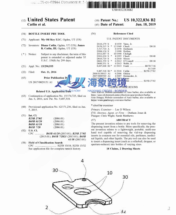 该专利描述了一种瓶口插入撬动工具(Bottle Insert Pry Tool),用于从各种瓶子中取出或安装分配器插件,如滚珠、滴管或其他开口减少器。专利摘要部分提到此发明涉及一种轻便的多功能手动工具,能够轻松地去除和更换瓶顶分配器插件,适用于精油、香水、药液和其他液体的容器。