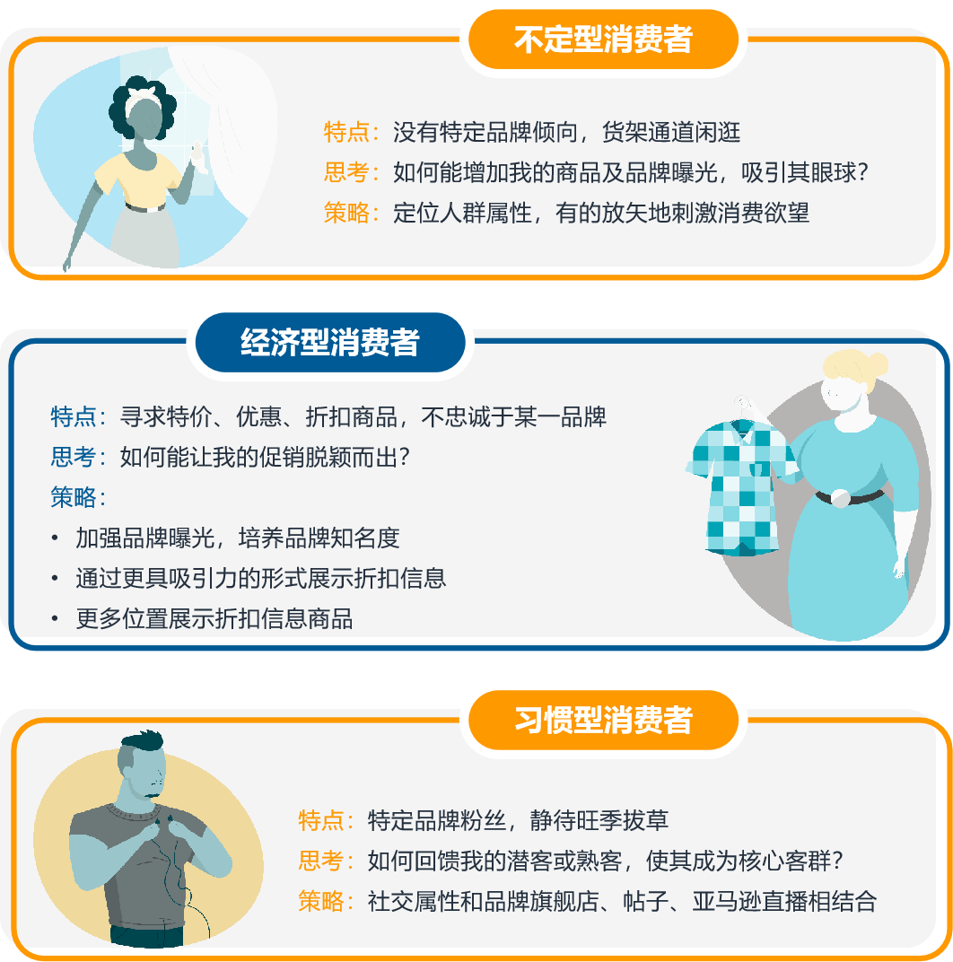据亚马逊调研显示,Prime Day 的流量高峰不仅体现在活动期间,还有大量消费者活跃在活动准备和收尾阶段。所以您需要将 Prime Day 的广告策略规划为三个阶段,依照阶段特性来规划推广重点。在进入阶段性策略之前,我们先来了解一下旺季的3种主要消费者类型: