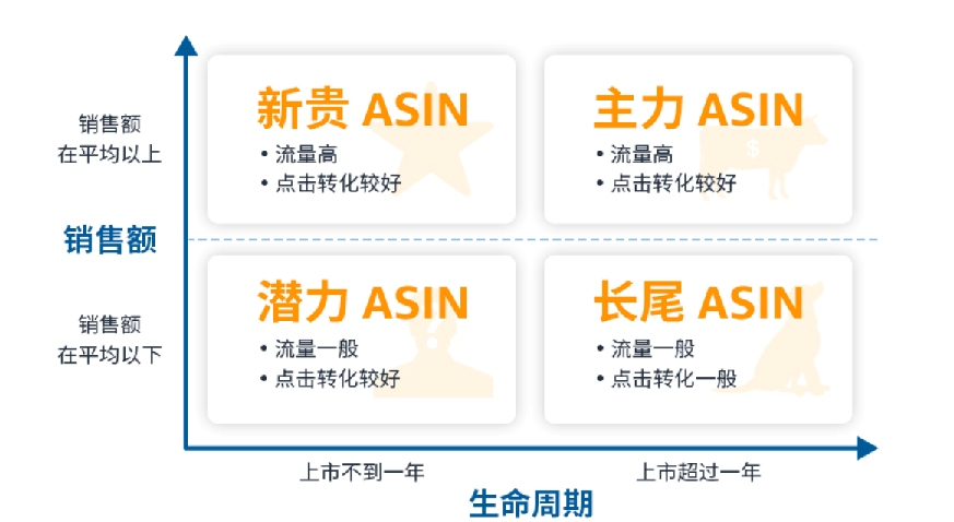 根据 ASIN 的销售额和生命周期将其分类,每种 ASIN 将对应不同的广告策略。