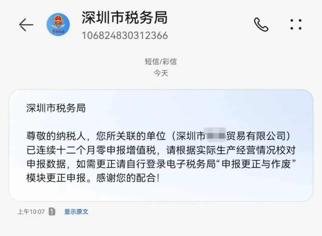 【深圳市税务局】尊敬的纳税人,您所关联的单位已连续十二个月零申报增值税,请根据实际生产经营情况校对申报数据……”