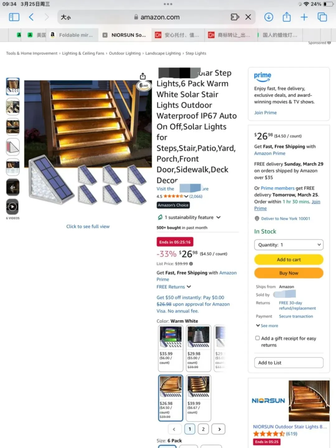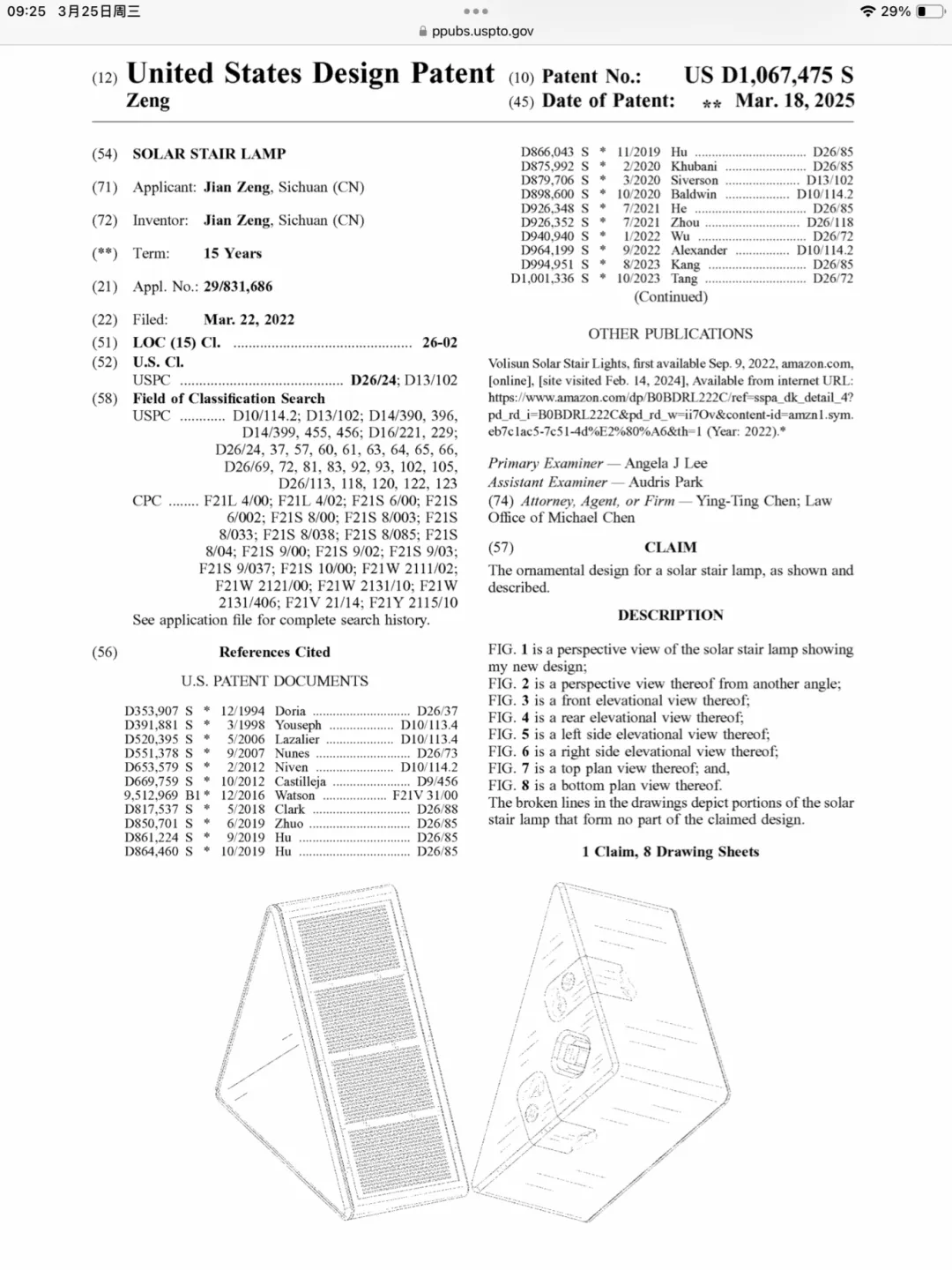 原告是一位国人卖家,本案是为其名下的一款太阳能楼梯灯的外观专利发起维权。这款太阳能楼梯灯专为户外台阶、楼梯等场景设计,核心在于采用四面照明设计,搭配多个LED灯珠,实现更广范围的发光覆盖,让台阶照明更完整、明亮,夜间散步更安全。本案由Dnl Zito律所代理,于2026年3月22日发起诉讼案件26-cv-00469,涉及外观专利维权,涉案专利申请日期为2022年3月22日,下证日期为2025年3月18日。