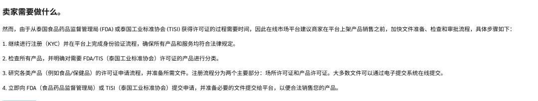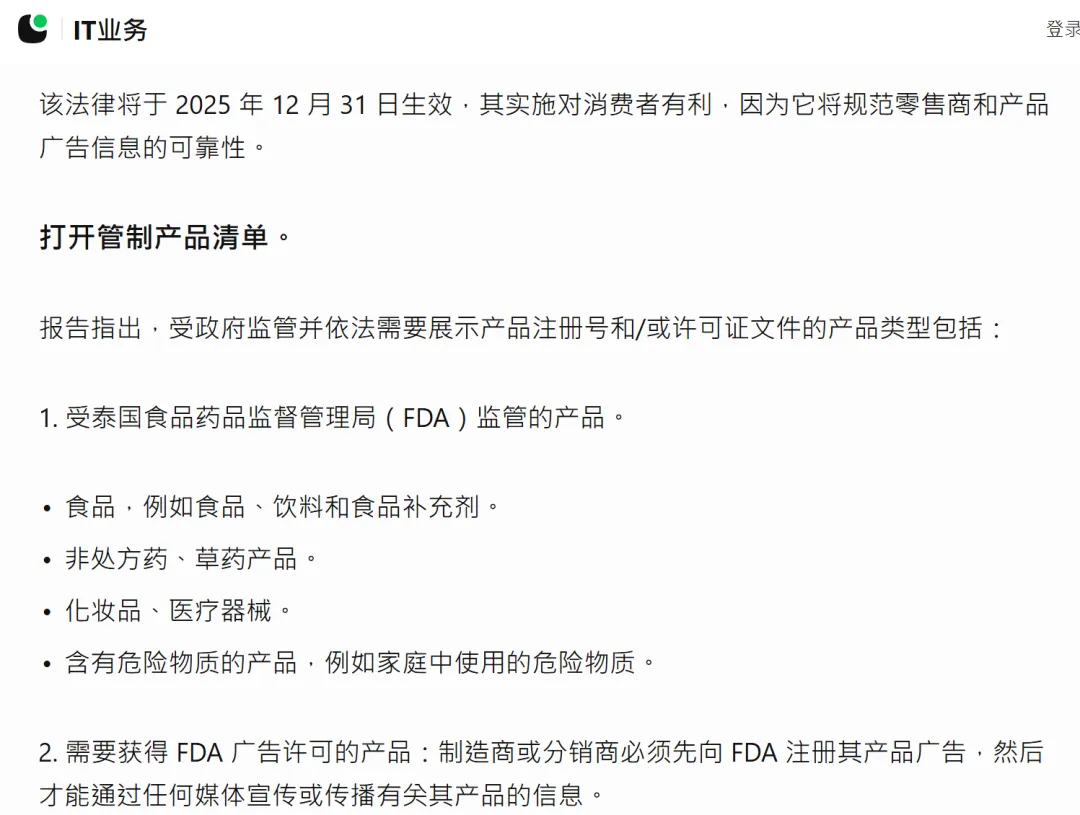 要求必须在商品页面显著位置,亮出泰国食品药品监督管理局(FDA)或泰国工业标准协会(TISI)颁发的许可证号或注册证书。哪怕是需要打广告的药品、食品,也得先拿到 FDA 的广告许可才能宣传。
