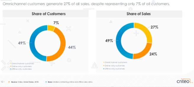 有趣的是,尽管全渠道客户具有高终身价值,但他们只占卖家所有客户的7%(如上图)。零售商需要以更个性化的方式瞄准的自己的理想受众,并提供最佳的购物体验。
