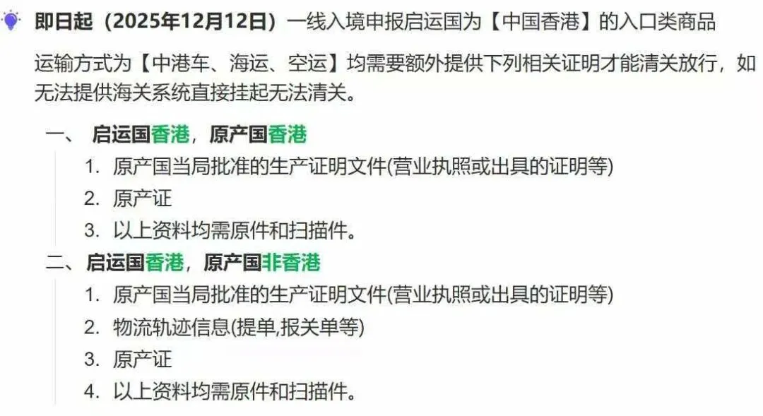 从业内人士给到的反馈来看,两大核心保税仓口岸的监管要求更具指向性。12月11日,南沙保税仓供应链关务明确,保税电商渠道进口保健品中,启运国与原产国均为中国香港的,需备齐生产企业官方资质及原产地证明;启运国为香港、原产国非香港的,额外要求补充完整物流轨迹信息,当日到港货物因未满足要求均未顺利放行。同期,郑州保税供应链关务同步提醒,启运国为中国香港、原产国非香港的保健品,一线进境报关单全部转为人工审单,缺漏资质或材料与货物实际情况不符将直接不予进口;即便原产国为香港的产品,也需提前备好生产资质与原产地证明,以备海关查验。