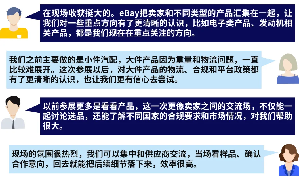 eBay巡展团让我们与优质供应商实现了精准对接,现场就能谈合作、看样品,效率非常高。我们入驻eBay平台后销售大大超过预期,接下来,我们将借力eBay的激励政策和选品工具,全力拓展商用车配件!