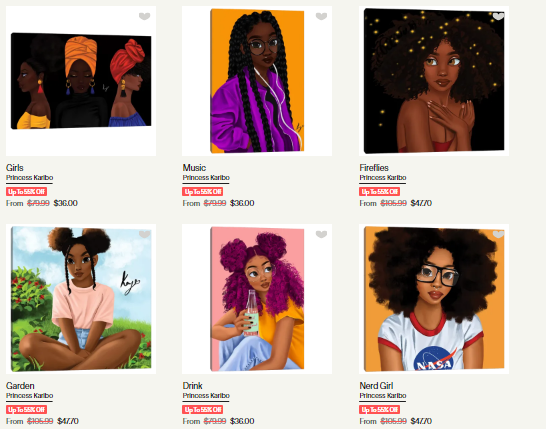 Princess Karibo 是来自尼日利亚的独立插画师(艺名 princess__kay_),她自学绘画,作品中常以黑人女孩为主角,表达黑人女性主义、文化自豪与自我认同。她擅长用明亮色彩和幻想元素,创作儿童插画、海报画作等,让年轻读者看到自己的形象和声音。她的作品在iCanvas、Displate、Advocate Art 等平台上公开展示和销售。