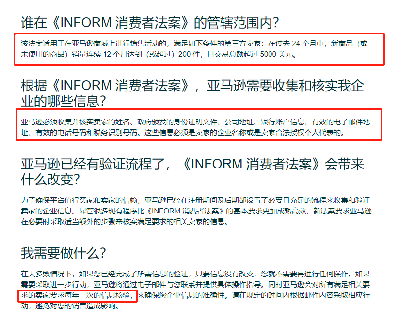 近期,大部分亚马逊美国站卖家都收到了亚马逊发来的账号验证邮件。起因源于一条新规:新的美国《消费者告知法》。该法律要求过去 24 个月中,新商品(或未使用的商品)销量连续 12 个月达到(或超过)200 件,且交易总额超过 5000 美元的卖家需要验证其有效信息,包含卖家姓名、身份证文件信息、办公地址、银行账户信息、有效的工作电子邮件、有效工作电话号码和纳税人识别号,否则将被停用账户。