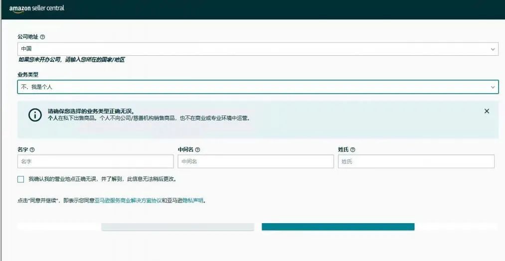 据小匠了解,目前后台账号验证的页面在公司地址选择“中国”后,下面会出现出现一个“不,我是个人卖家”的选项,如下图所示。