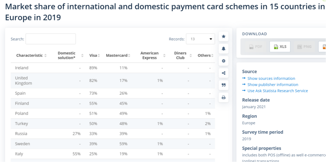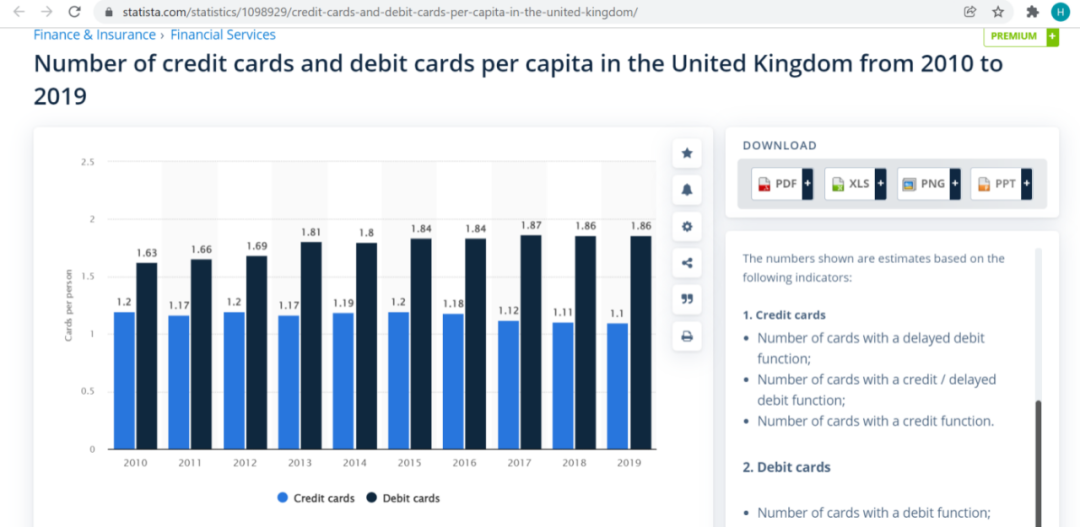 从2019年英国脱欧前Statista公布的数据看,英国人均信用卡保有量只有1.1张,就是说有很大一部分人群只有一张信用卡。