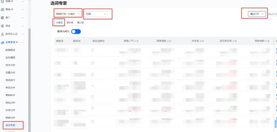 在生意参谋中的-选词专家模块,通过筛选类目、国家市场、时间和热度来选出热搜词,并以此数据为依据确立好自己的主推词和次推词。