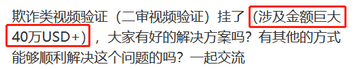据该卖家所述,2022年年底有一个店铺就收到了视频验证的绩效通知,同年12月的时候,这位卖家确实也让法人和运营一起配合了那次视频验证,但是,亚马逊一直盯着法人问一些问题,法人表现力不行,导致视频验证没有通过、店铺被判涉嫌欺诈而关店,账号里面有巨额资金,40万USD+。