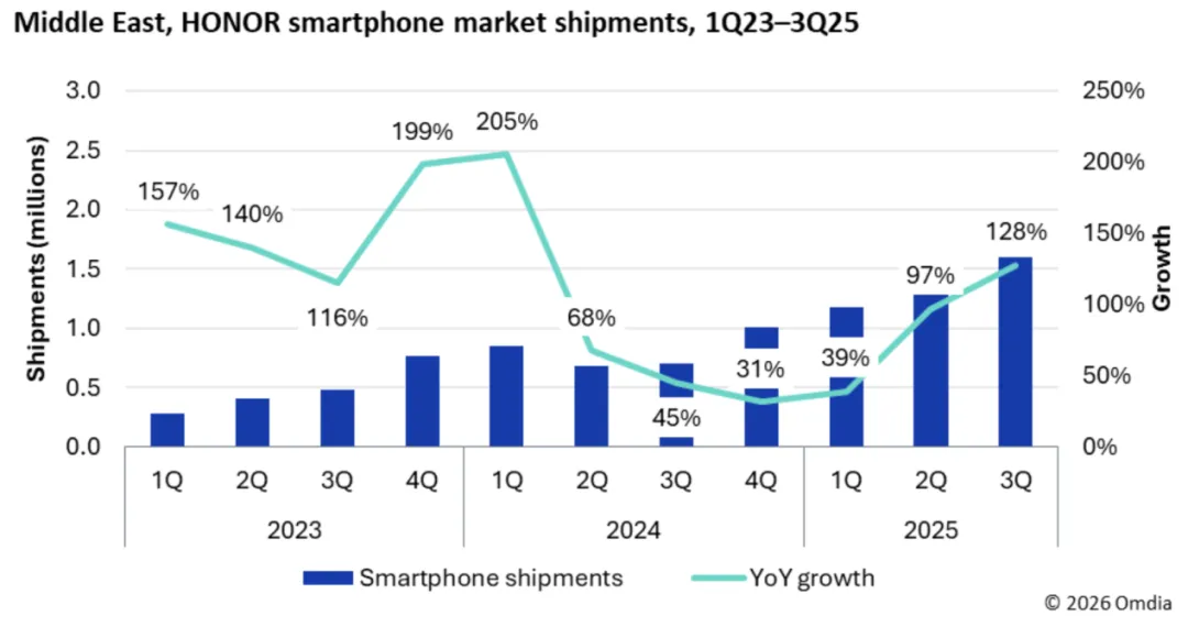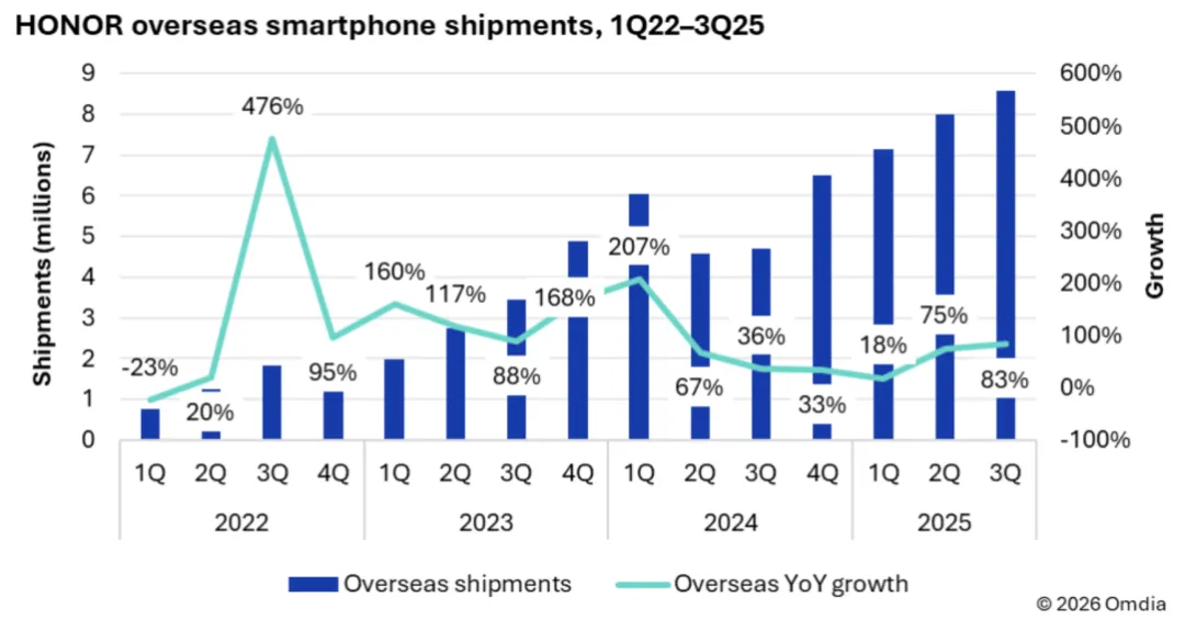根据 Omdia 数据显示,荣耀 2025 年海外智能手机出货同比增长约 55%,在全球前十 Android 品牌中海外增速最高;同时,海外销量在 2025 年首次占据总销量约 50% 以上。