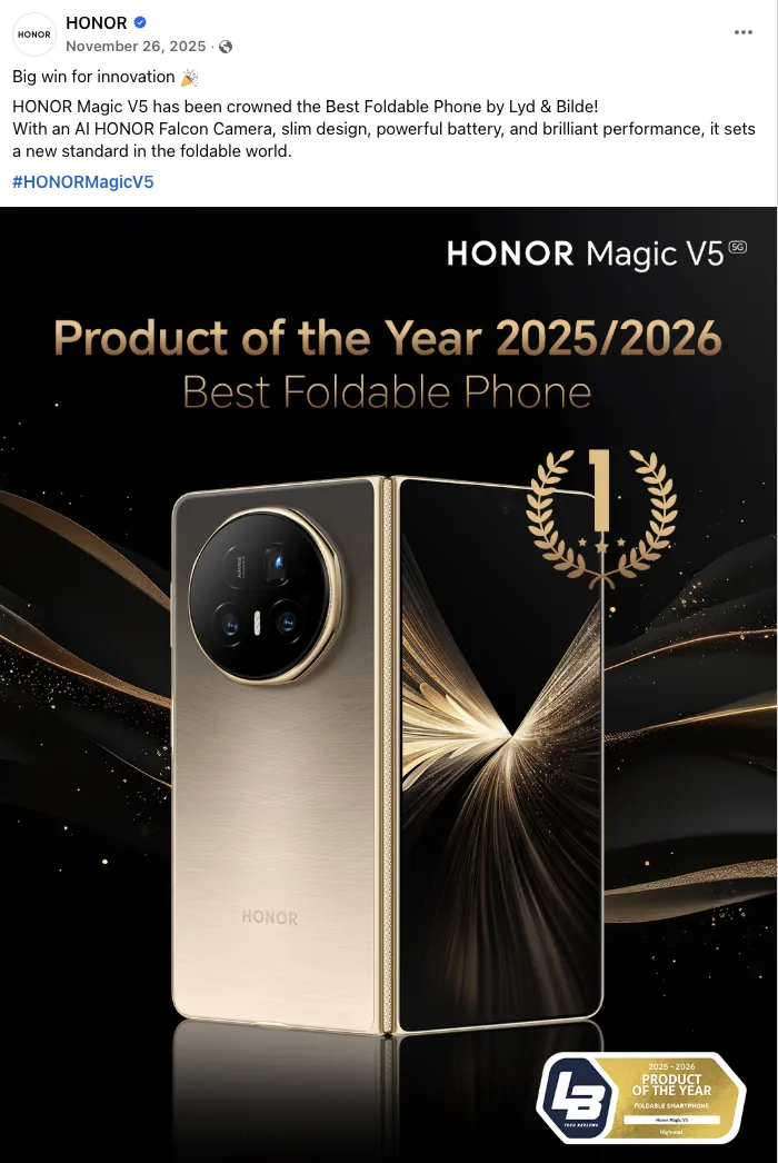 与早期中国手机品牌出海依赖低价策略不同,荣耀这轮海外增长并非建立在价格战上。Omdia 数据显示,2025 年荣耀海外主要增长在中高端价位段($300–$499),主推的产品线包括 Magic 系列、折叠屏机型、高性能影像中端机型等。