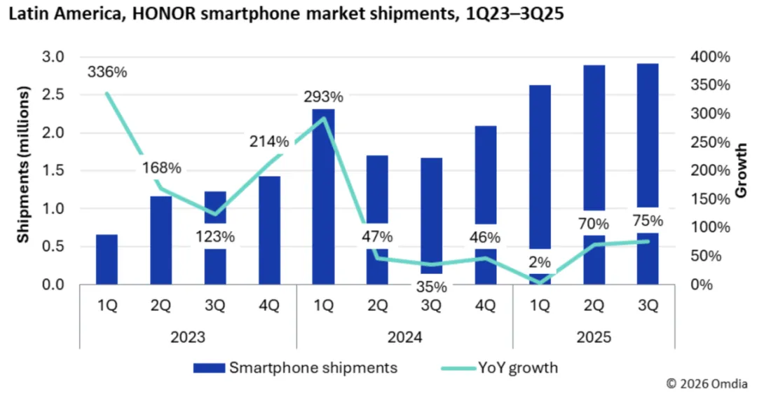 拉丁美洲市场长期是中国手机品牌的重要战场,而荣耀在这一地区依托运营商分销与渠道拓展继续打下扎实基础,成为其全球出货量的重要支撑。